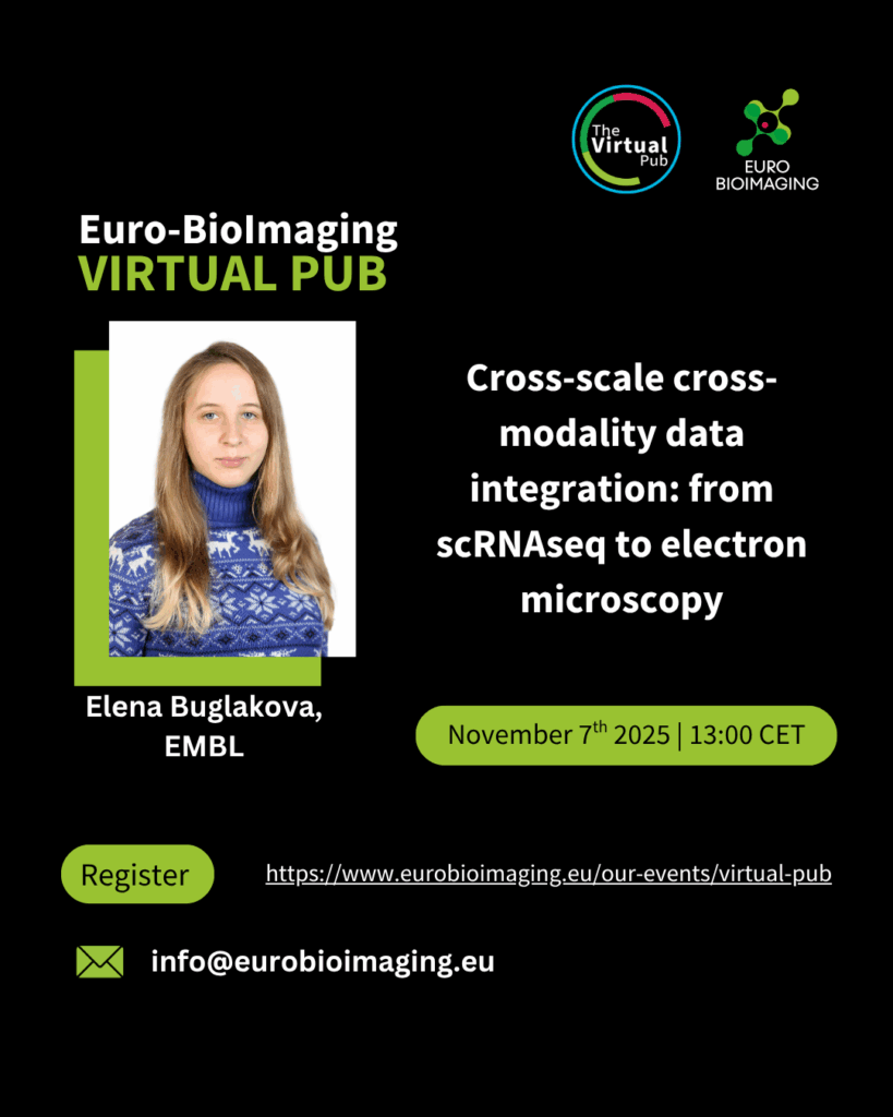 Please join us for the Virtual Pub on Friday, November 7th at 13:00 CET. We welcome Elena Buglakova, EMBL, on “Cross-scale cross-modality data integration: from scRNAseq to electron microscopy”