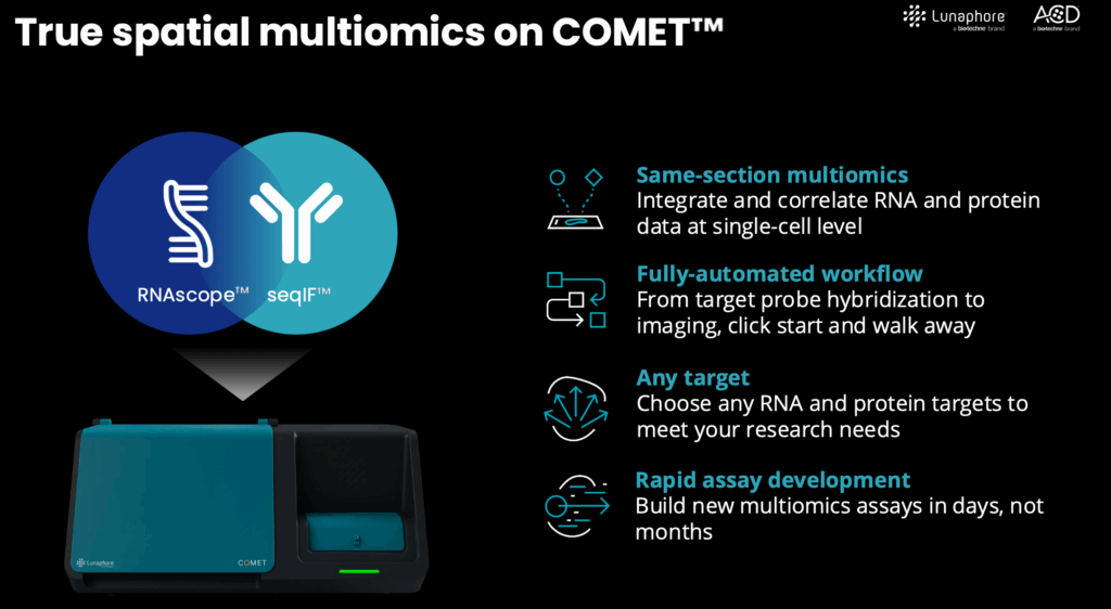 Join us to discover how Lunaphore’s COMET platform enables fully automated, high-plex spatial multi-omics analysis directly on tissue sections. Combining sequential immunofluorescence (SeqIF™) technology with integrated high-resolution imaging, COMET allows researchers to perform highly multiplexed protein and RNA detection using standard, unconjugated antibodies and RNAscope® probes without manual intervention.