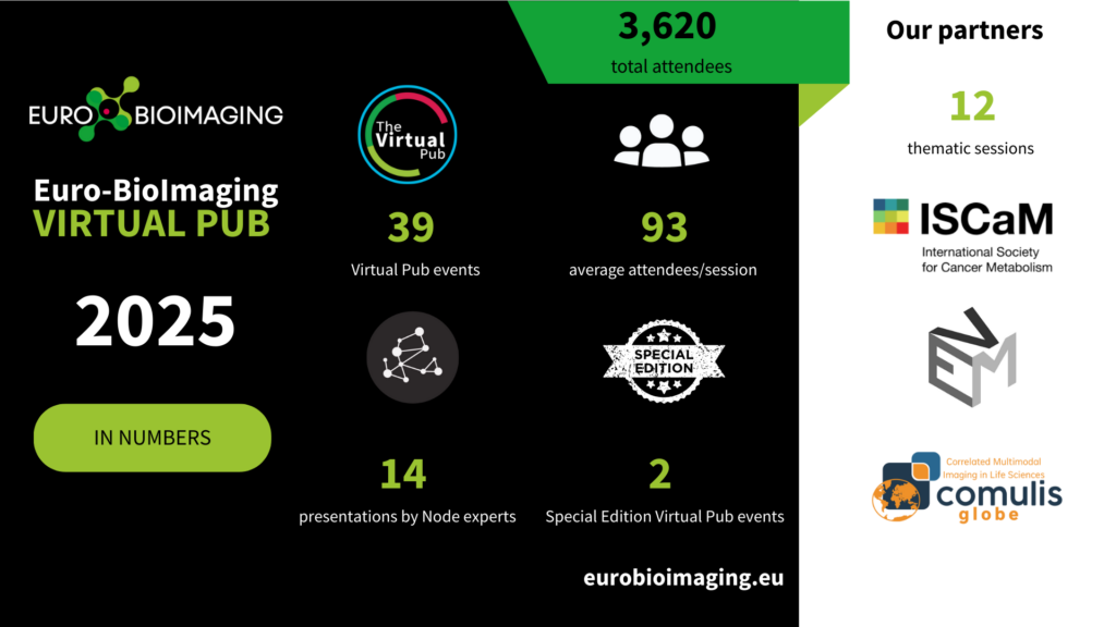 With strong attendance, a diverse and carefully balanced programme, and active participation from Nodes, users, and partner communities, the 2025 Virtual Pub has once again proven to be a cornerstone of Euro-BioImaging’s community engagement and training activities. Building on this momentum, in 2026 we look forward to continuing to welcome everyone to the Virtual Pub as an open and welcoming space for sharing knowledge, fostering collaboration, and connecting Europe’s imaging community.