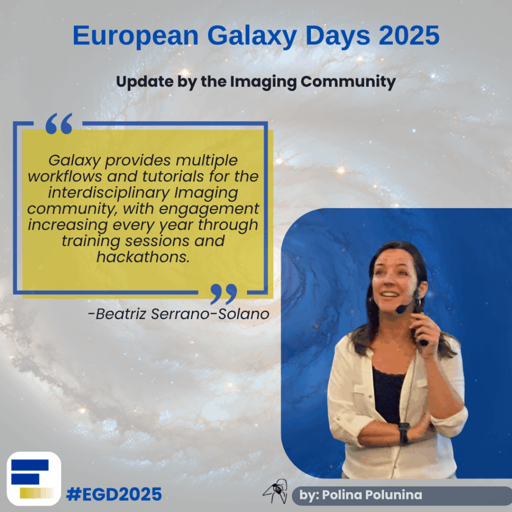 Euro-BioImaging is also represented as a Special Interest Group (SIG) at the Galaxy Community Board (GCB), where we discuss common pain points and share resources between scientific communities, crucial for cross-disciplinary collaboration and avoiding duplicated effort.