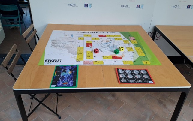 Then, two smaller groups (7-8 people) were formed to play the two main board games prepared by Sara, Silvia and Federica: the “Imaging Game of the Goose” (similar to Snakes and Ladders) and the “Game of metabolism.” Each group got 30 minutes to understand and play the first game, then they switched. Additional activities, such as memory and puzzles, completed the fun activities.